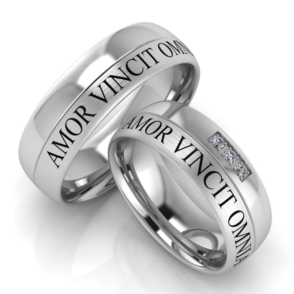 Gravierte Trauringe aus Weißgold 585 mit Brillanten, speziell von unserem Goldschmied für Sie vollendet: Wenn Sie auch der Meinung sind – Liebe besiegt alles – dann sind diese mit „Amor Vincit Omnia“ gravierten Eheringe aus Weissgold Ihre Liebesboten! Dank der tollen Trageeigenschaften des 585er Weißgoldes, genießen Sie die dauerhafte Qualität, denn solch eine 14-karätige Golglegierung zählt in ihrem Bereich zu den Festesten und wird daher besonders oft für den Trauring gewählt. Ganz anders als eine günstige 333er Goldlegierung, erhält die 585er gewöhnlich ihre Farbe und ist beständig gegen Einwirkungen von außen. Edel strichmatt gehalten, werden solche Weißgoldringe besonders stilvolle Begleiter, die zum Star eines jeden Looks werden. Mit 7 mm in der Breite, sind die weißgoldenen Schönheiten mit liebevoller Gravur breiter als ein klassischer 4 - 5 mm breiter Ehering und wirkt besonders auffällig. Gleich drei funkelnde Diamanten im Brillantschliff (ugs. = Brillant) bringen mit je 0,02ct. (= ca. 1,7 mm im Durchmesser) den Luxus an den Brautfinger und strahlen Dicht an Dicht über der Außengravur um die Wette. Nutzen Sie für die passgenaue Ringanfertigung in unserer Ringschmiede gern unseren praktischen Ringgrößen-Service und freuen Sie sich über den Versand in einem passenden Ringetui. Wir wünschen Ihnen eine echte Traumhochzeit und viel Freude mit unseren weißgoldenen Trauringen!