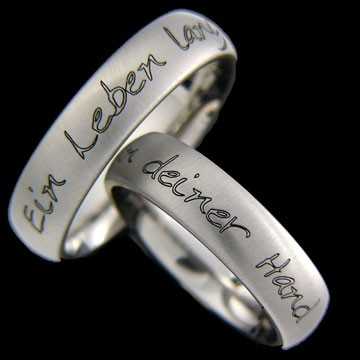 Die Schriftart ist Crystal Hands, die Gravur wird nur in Kontur dargestellt, d.h. nicht ausgefüllt. Diese Gravurart verleiht dem Ring zusammen mit der besonderen Mattierung ein sehr edles und dezentes Design.
