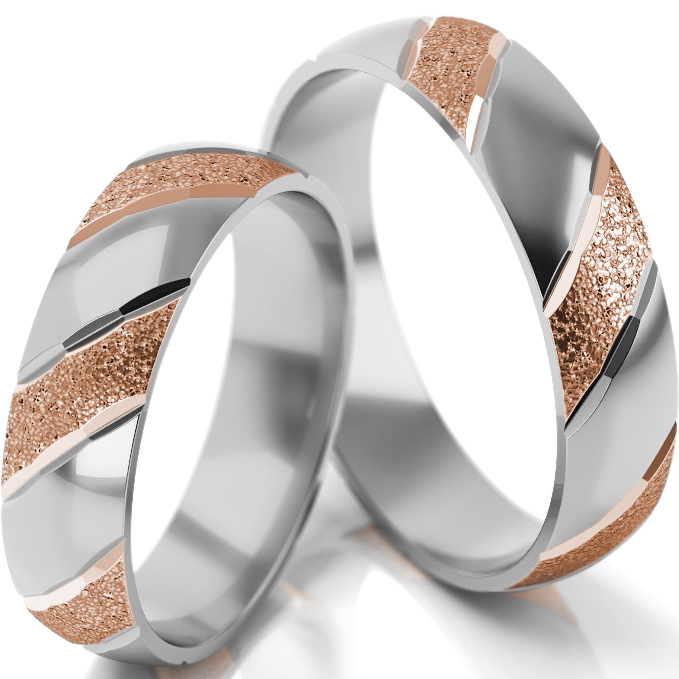 Diese wunderschönen Trauringe kombinieren 333er Weißgold und Rotgold auf eine äußerst elegante Weise, indem sie die kühle Schlichtheit von Weißgold mit der warmen Eleganz von Rotgold vereinen. Der spezielle Schliff und die Textur im Rotgoldteil dieser Ringe fügen eine zusätzliche Dimension der Raffinesse hinzu, was sie zu einer perfekten Wahl für Paare macht, die einzigartige und symbolträchtige Eheringe suchen.