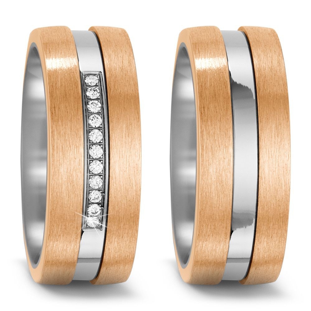 Liebe Braut, lieber Bräutigam, diese Trauringe aus Bronze der TitanFactory Schmuckkollektion ,,TI BRONCE“ veredeln Ihre Liebe zueinander durch das stille Spiel des aufregenden Kontrastes. Mit der rotschimmernden Bronce sowie dem High-Tech-Material Titanium, inspirieren diese Ringe zu einer Gedächtnisreise hin zu dem was Ihre tiefe Verbindung ausmacht. Denn die bronzenen Bicolor-Ringe versinnbildlichen nur zu gern, wie zwei sich finden und gemeinsam Wundervolles entstehen lassen. Dabei bildet das hochwertige Titanium den beständigen Kern und versinnbildlicht das feste Fundament auf dem Ihre Liebe steht. Kombiniert mit den „unendlich“ verlaufenden bronzenen Partien, komplettiert das Ringdesign dieser Trauringe aus Bronze eine ganze Liebesgeschichte, denn auch Sie werden Ihren Weg mit Ihrem Partner teilen, voll wärmender Liebe und feuriger Leidenschaft. Mit sagenhaften elf Diamanten erstrahlt der Damenring blick-magnetisch und erhebt Ihr großes Glück zum unübersehbaren Mittelpunkt. Zeit also, das Ja-Wort auszusprechen: Ja zu bester Ringqualität aus Deutschland, ja zu ausdrucksstarken Schmuckstücken, die Ihre Hochzeit stimmungsvoll unterschmücken.
