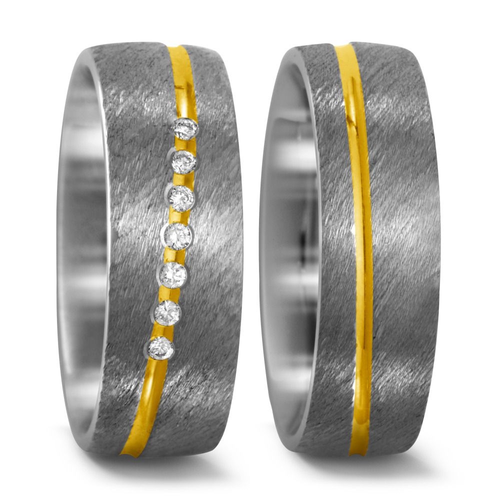 Liebe Braut, lieber Bräutigam, diese Trauringe aus Titan und Gelbgold 750 mit Brillant wirken spektakulär am Ringfinger und begleiten Sie mit aller Stärke ganz beständig auf Ihrem gemeinsamen Liebesweg!