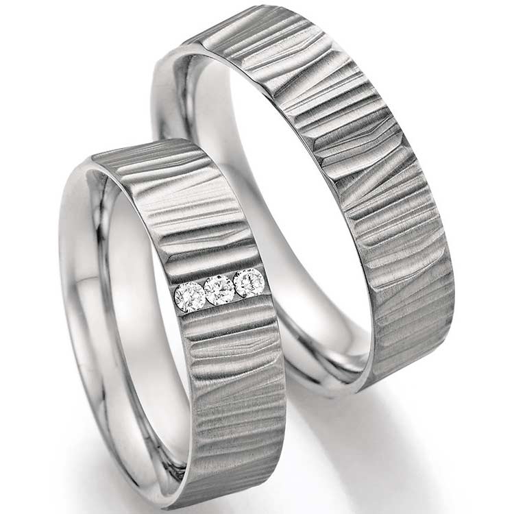 Die strukturierte Oberfläche dieser Titanringe aus der neuen Avantgarde Kollektion zeigt mit viel Charme und natürlich trotzdem bestem Tragekomfort sämtliche Höhen und Tiefen, die Ihr Eheleben hoffentlich zu bieten hat! Für glänzende Abwechslung sorgen die drei strahlenden Brillanten, die für immer den Glanz in Ihren Augen bei der Hochzeitszeremonie einfangen und Sie daran erinnern sollen.