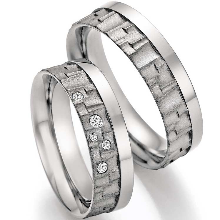 Die Avantgarde Kollektion aus dem Hause Brüder Nowotny ist eine Quelle der Inspiration für alle Hochzeitspaare, die das Besondere suchen. Auch wenn Titan als Trauringmaterial sich bereits etabliert hat, entwickelt sich das Design stetig weiter in eine Vielfalt, die bislang den Edelmetallen Gold und Platin vorbehalten schien. In diesem Modell ergänzen sich Gegensätze in der Ringoberfläche mit den scheinbar willkürlich eingestreuten brillanten Glanzpunkten zu einem Feuerwerk massiver Individualität.