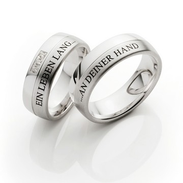 - Anmerkung: Die abgebildete Beispiel-Außen-Gravur lautet auf dem Damen-Verlobungsring EIN LEBEN LANG...; auf dem Herren-Verlobungsring ...AN DEINER HAND. Gravur-Text und Schriftart sind jedoch FREI wählbar.